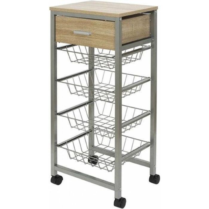 De trolley is uitgerust met vier zwenkwielen, waardoor hij eenvoudig te verplaatsen is binnen de keuken of naar andere kamers. Dit maakt het mogelijk om hem te gebruiken als serveerwagen voor een etentje of als extra werkruimte. Het ontwerp is functioneel en stijlvol, waarmee het de perfecte aanvulling is voor elke ruimte.