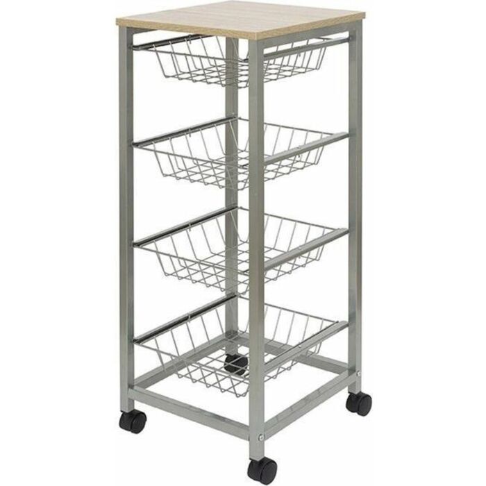 Het slimme ontwerp met vier uitneembare manden maakt organiseren en aanpassen eenvoudig. Het houten werkblad biedt extra ruimte voor bereidingen of serverservice, terwijl de wieltjes zorgen voor moeiteloos verplaatsen.