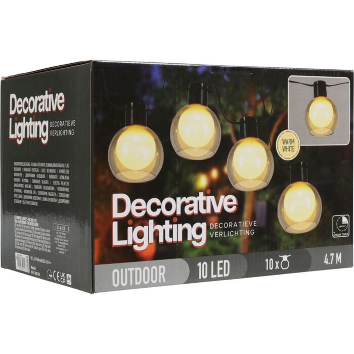 Deze feestverlichting bestaande uit 10 LED lampen is perfect voor het creëren van een sfeervolle ambiance, zowel binnen als buiten. Met een totale verlichte lengte van 2,70 meter is deze verlichting ideaal voor feesten, evenementen of een gezellige avond in de tuin.