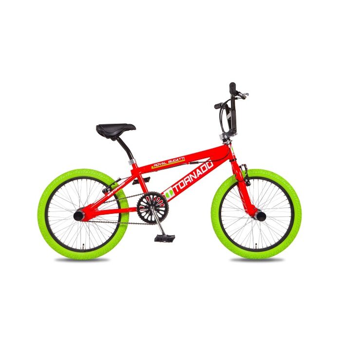 Ontdek de Freestyle BMX 20" Royal-Bugatti: een hoogwaardige freestylefiets met een opvallend rood frame en groene banden. Deze BMX combineert stoere looks met robuuste prestaties, ideaal voor zowel beginners als ervaren stuntliefhebbers.