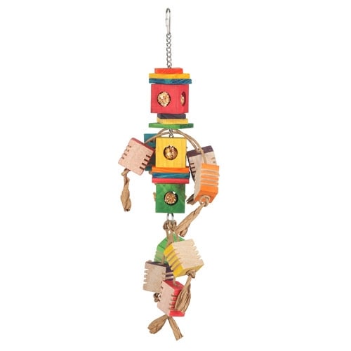 Het papegaaienspeeltje heeft een handige afmeting van 46x11 cm, wat het perfect maakt voor kleinere vogels. Het speelgoed is vervaardigd uit duurzame houten blokken en gedraaid papier, waardoor het zowel stevig als veilig is voor uw vogel om mee te spelen.