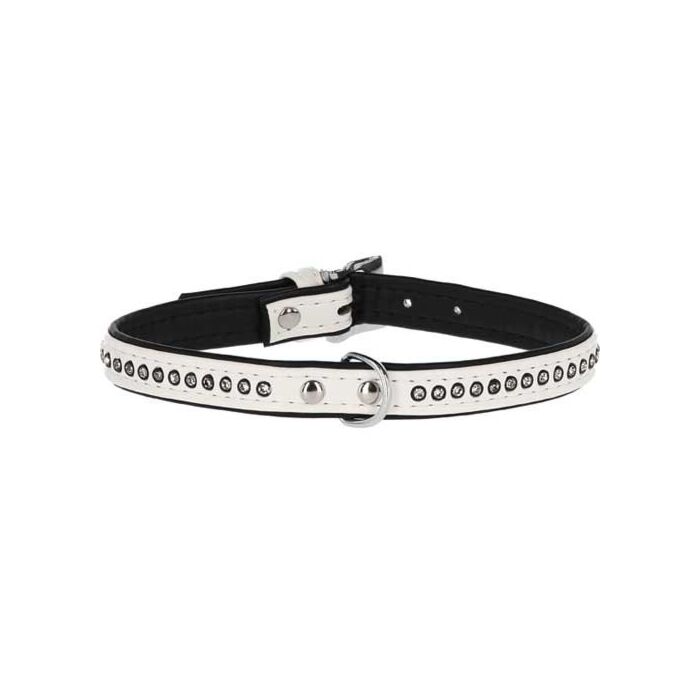Deze fraaie halsband uit de Diamant-collectie is vervaardigd van eersteklas imitatieleer en afgewerkt met volledig verchroomd beslag. De halsband krijgt een extra chique uitstraling doordat hij is bezet met een rij sprankelende strass-steentjes.