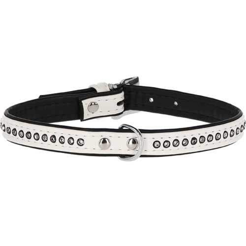 Deze prachtige halsband uit de Diamant-collectie is vervaardigd van hoogwaardig imitatieleer en voorzien van volledig verchroomd beslag. Dankzij een rij schitterende strass-steentjes krijgt de halsband een extra chique uitstraling.