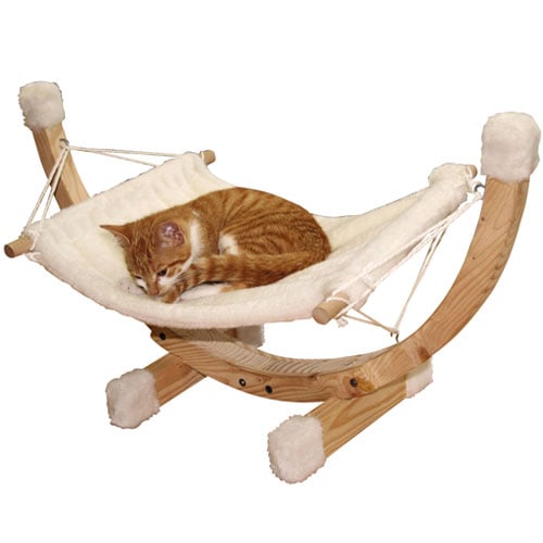 Leuke hangmat met houten frame en een zacht pluche ligbed. Door zijn afmetingen is deze hangmat voornamelijk geschikt voor kleinere katten.