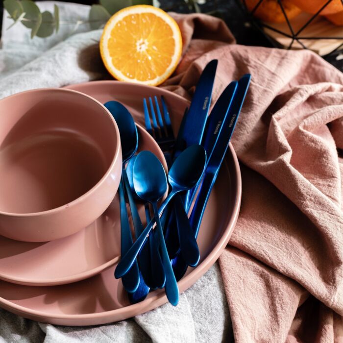 De bestekset is ontworpen voor vier personen en is gemaakt van duurzaam roestvrij staal dat lang meegaat. Het marineblauwe matte design voegt een vleugje elegantie toe aan elke tafelsetting.