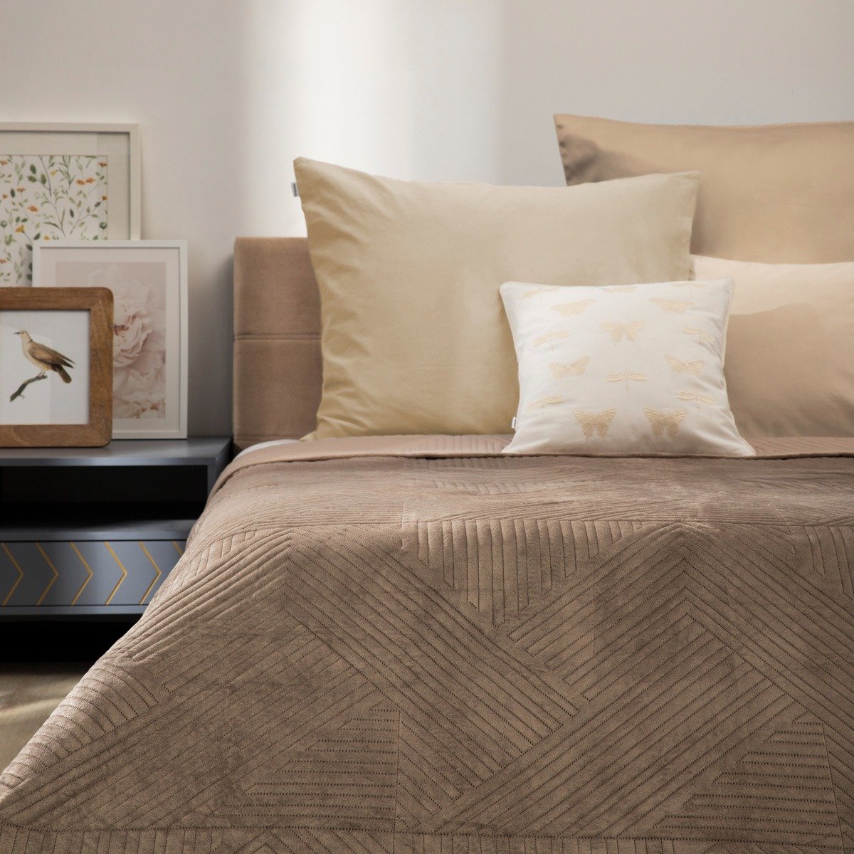 Wrap je slaapkamer in luxe en moderne stijl met de AURUM bedsprei. De subtiele kleur en geometrische quilting creëren een elegant ontwerp dat klasse toevoegt aan elk interieur. Gemaakt van een zacht stof, ziet het er niet alleen mooi uit, maar biedt het ook comfort en gemak.