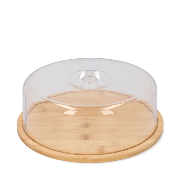 De serveerschaal heeft een diameter van 27,5 cm en is vervaardigd uit hoogwaardig bamboehout. Bamboe is een ecologisch verantwoord materiaal dat duurzaam, stevig en bestand is tegen dagelijkse belastingen. De deksel is gemaakt van transparant plastic, wat zorgt voor extra bescherming en zichtbaarheid van de geserveerde lekkernijen.