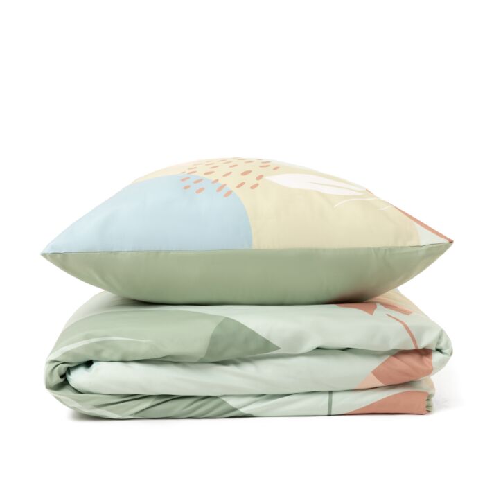 Het vrolijke bloemmotief met kleurrijke bladeren op een lichtgroene achtergrond geeft het NIRMA beddengoed een eigentijdse uitstraling die gemakkelijk past in verschillende interieurstijlen. De set wordt gesloten met een handige rits voor eenvoudige bediening.
