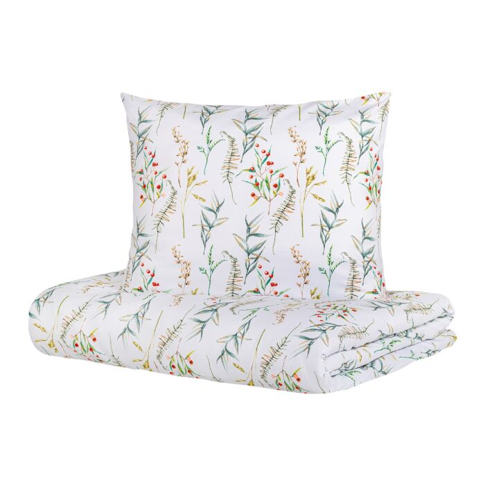 Alle stukken PADANG beddengoed zijn dichtgeritst. Het zijn: twee kussenslopen (afmetingen 70x80cm) en een dekbedovertrek (afmetingen 200x220cm). Ze zijn genaaid van witte microvezel waarop losse plantenstengels zijn gedrukt. De print wordt gedomineerd door groen in verschillende tinten en felrood.