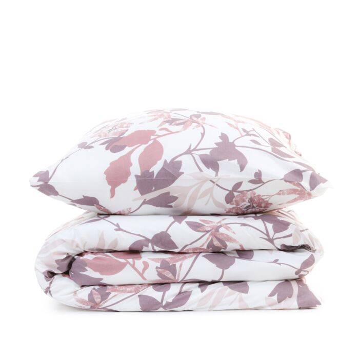 De ROSA beddenset bestaat uit een dekbedovertrek van 160 x 200 cm en een kussensloop van 70 x 80 cm. Op de witte achtergrond staan verschillende bladeren. Het motief is uitgevoerd in gedempte roze tinten. Het beddengoed wordt gesloten met een rits.