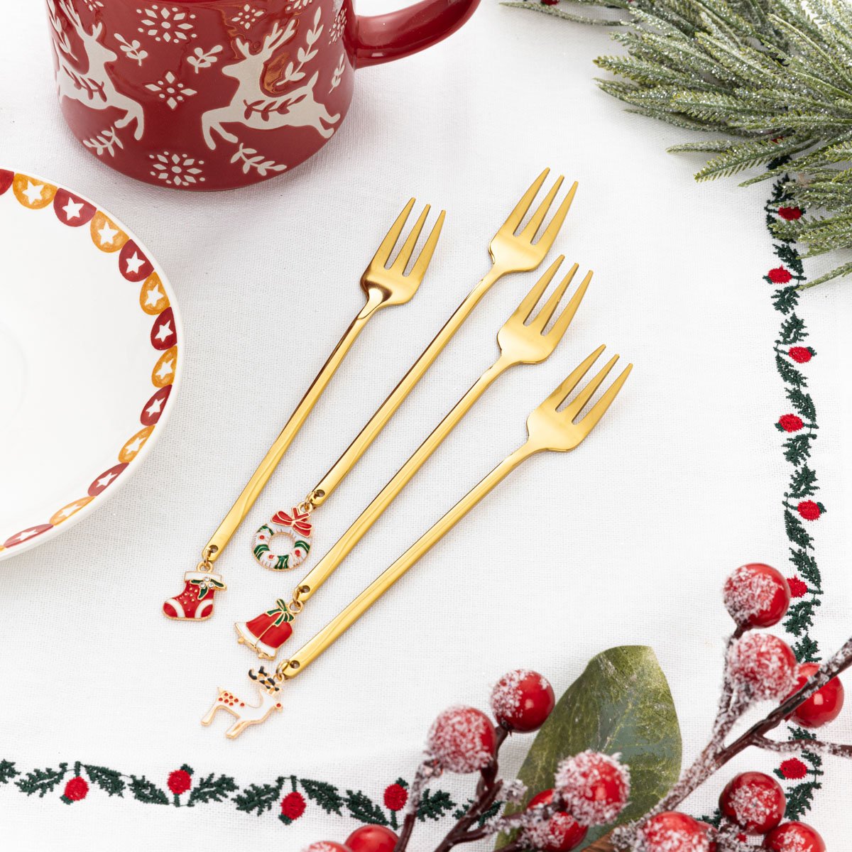Het ontwerp van deze dessertvorken is niet alleen elegant maar ook praktisch. Door hun stevige constructie zijn ze ideaal voor het serveren van verschillende nagerechten. De feestelijke uitstraling maakt ze extra speciaal voor de kerstperiode.