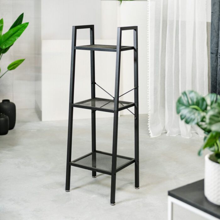 - Kenmerken: Drie opengewerkte planken, stabiel metalen frame, zwarte kleur, afmetingen 35 x 35 x 101,5 cm (B x D x H), maximale belasting per plank is 15 kg.