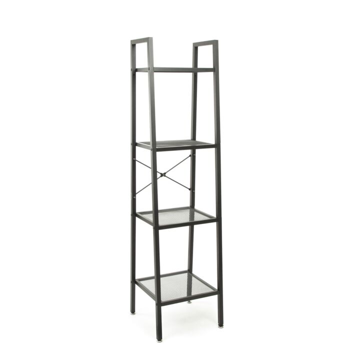 - Kenmerken: Ladderontwerp met vier open planken op een stevig metalen frame, matzwarte afwerking; afmetingen 35 x 35 x 135 cm; maximale belasting per plank 15 kg.