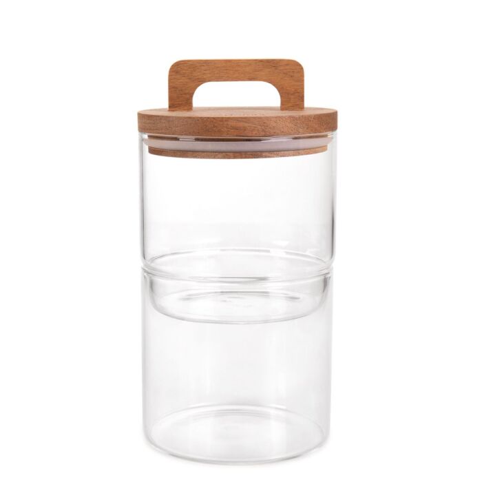 Glazen container voor het bewaren van voedsel in de keuken. De CARLOS container bestaat uit 2 kleinere containers die op elkaar worden gestapeld, waardoor je ruimte bespaart in de kast of op het aanrecht. De bovenste container wordt afgesloten met een houten deksel met een comfortabel handvat. Het geheel ziet er prachtig uit, waardoor de container niet alleen een handig maar ook een stijlvol accessoire is.