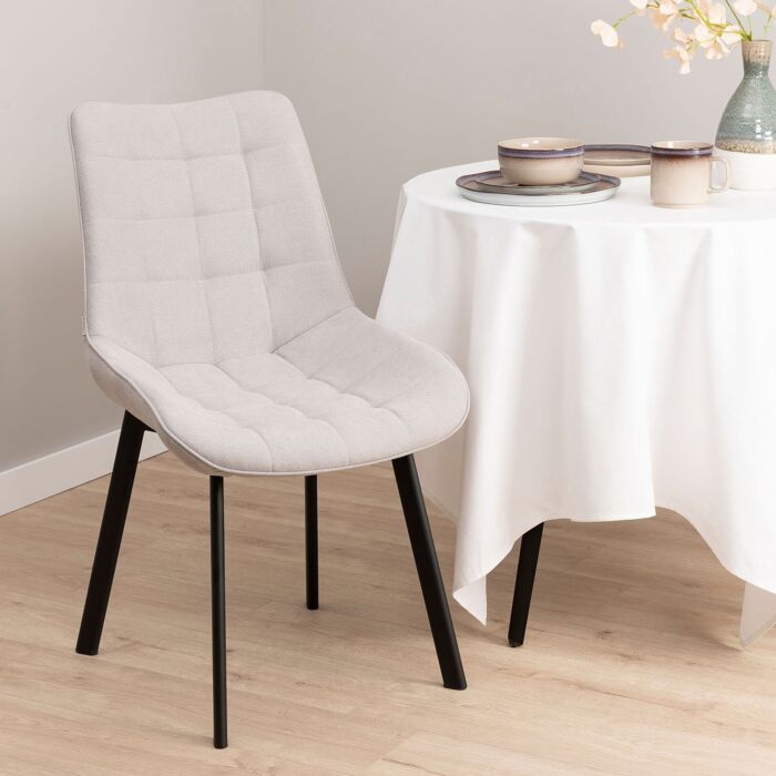 Met zijn comfortabele en brede zitting biedt de Colin stoel een uitstekend zitcomfort. De rugleuning is speciaal geprofileerd om een optimale ondersteuning te bieden. De elegante combinatie van lichtgrijze stof met zwart metaal geeft de stoel een chique uitstraling, waardoor hij een statement kan maken in elke ruimte.
