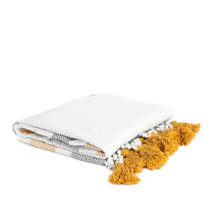 Een stijlvolle deken voor je bed of bank die je interieur een knusse uitstraling geeft. Het lichtgekleurde oppervlak is versierd met zwarte en gele strepen, waarop het mooie weefsel goed te zien is. De korte zijden van de deken zijn afgewerkt met een mosterdkleurige franje. Warm en zacht, de perfecte metgezel voor koude dagen.