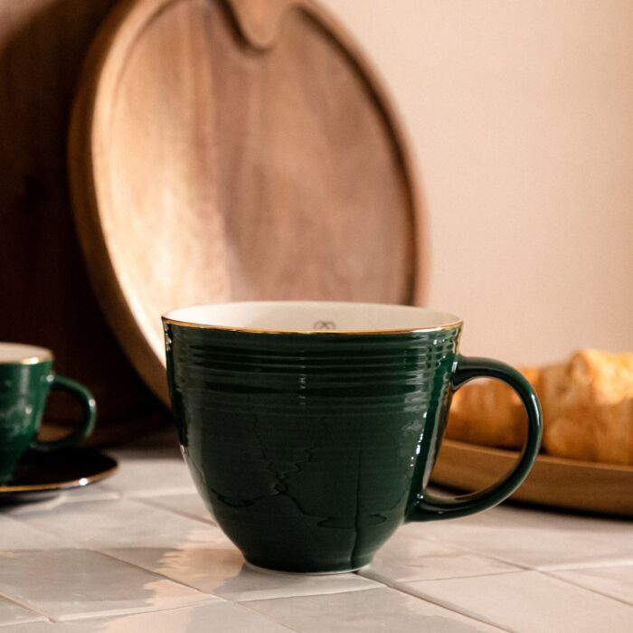 De HOMLA Ellie minimalistische mok is perfect voor liefhebbers van een stijlvol kopje koffie of thee. Deze theekopje en koffiekopje set heeft een prachtig groen ontwerp met een subtiele gouden decoratie die een vleugje elegantie toevoegt aan je drinkervaring.