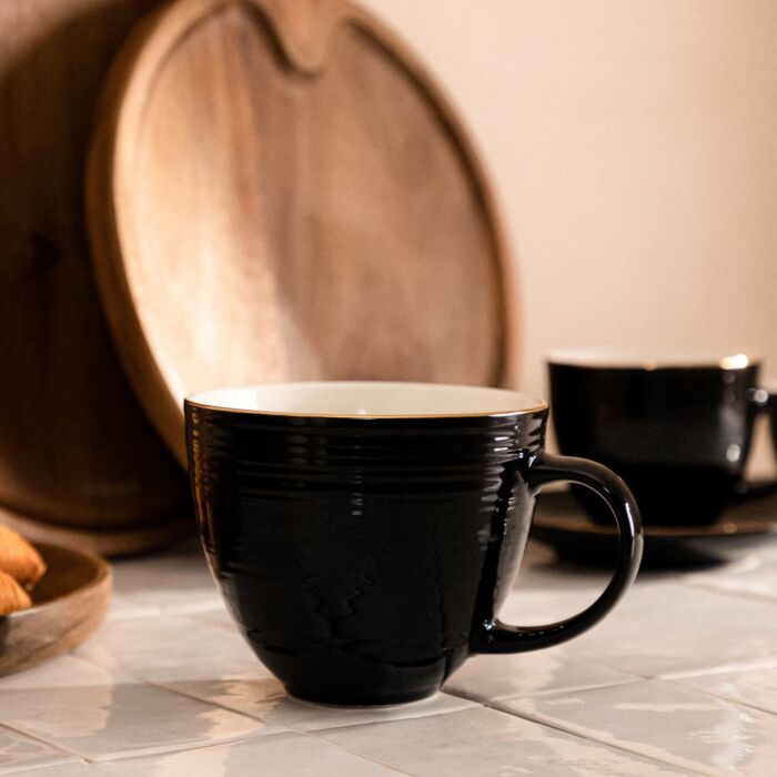 HOMLA Ellie minimalistische mok – koffie- en theekopjeset, zwart met gouden decoratie, porselein, 470 ml