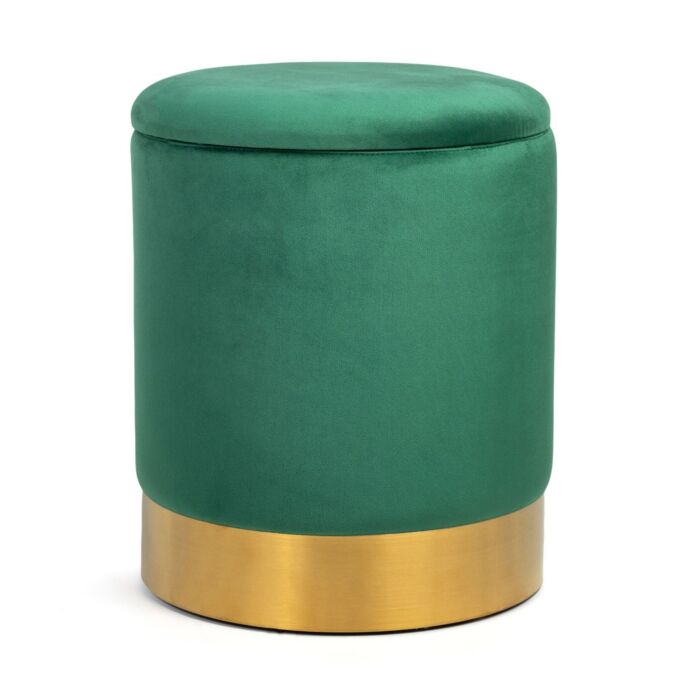 HOMLA Fica decoratieve tweekleurige opbergkruk – opvallend design, zitting én voetensteun – comfortabele poef-stoel van polyester en metaal, 35 x 42 cm, groen en goud