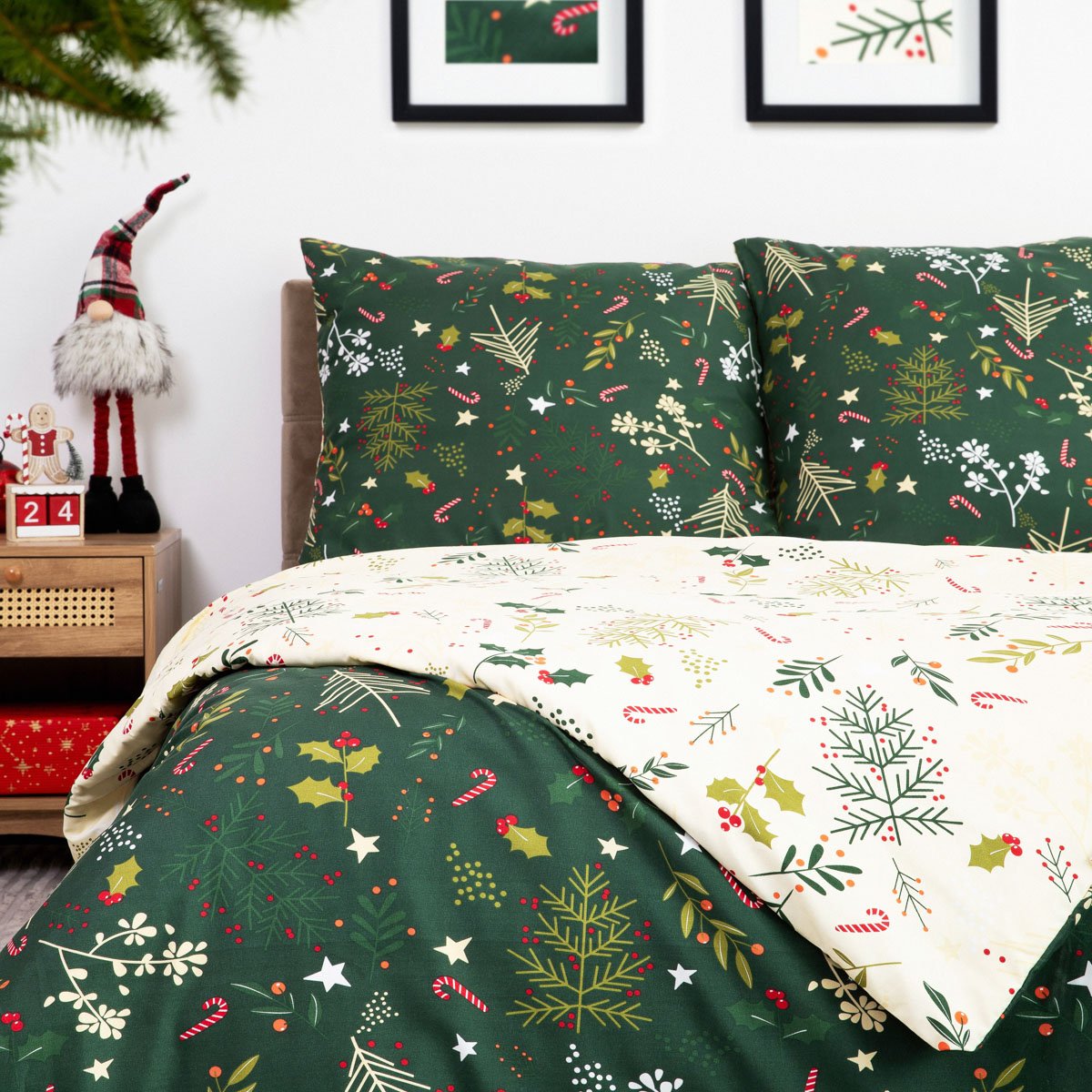 Het kerstsysteem GODIS bestaat uit een dekbedovertrek van 160 x 200 cm en twee kussenslopen van 70 x 80 cm. Dit charmante feestontwerp met dennenappels, hulstblaadjes en maretak gaat prachtig samen met een dubbelzijdige achtergrond die je in staat stelt om de opstelling te veranderen.