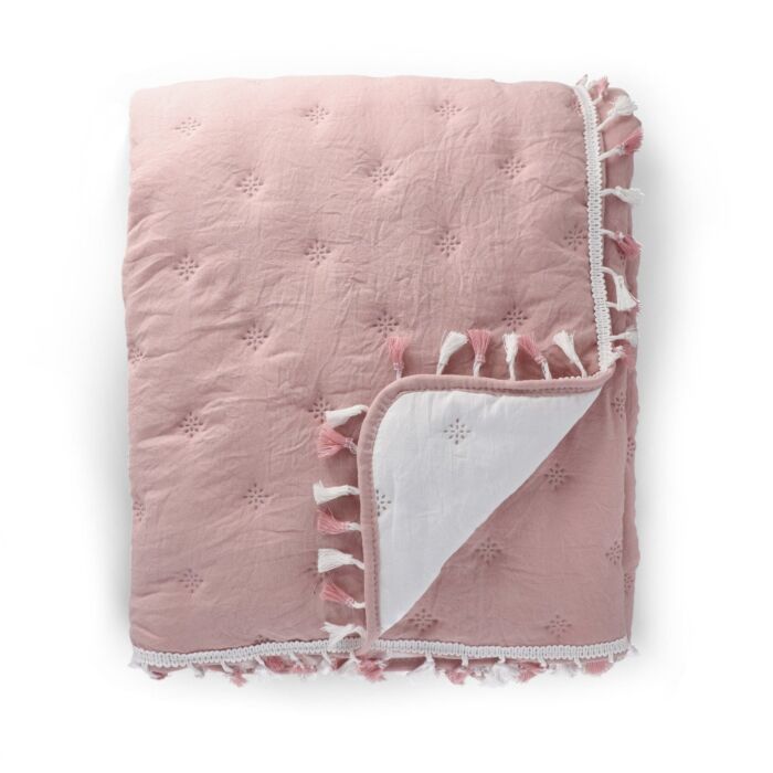 De sprei GRANNA heeft een warme roze kleur die het interieur gezelliger maakt. Hij is voorzien van kleine reliëfs in een regelmatig patroon en afgewerkt met afwisselend witte en roze kwasten die direct in het oog springen. De achterkant is wit, zodat je met de omgekeerde zijde de sfeer subtiel kunt bijstellen. De sprei is niet alleen decoratief, maar beschermt ook je beddengoed tegen vuil en stof. Hij kan dienen als deken tijdens een dutje overdag of als extra laag tijdens koude nachten. Afmetingen: 200 × 220 cm. Ook verkrijgbaar in beige.