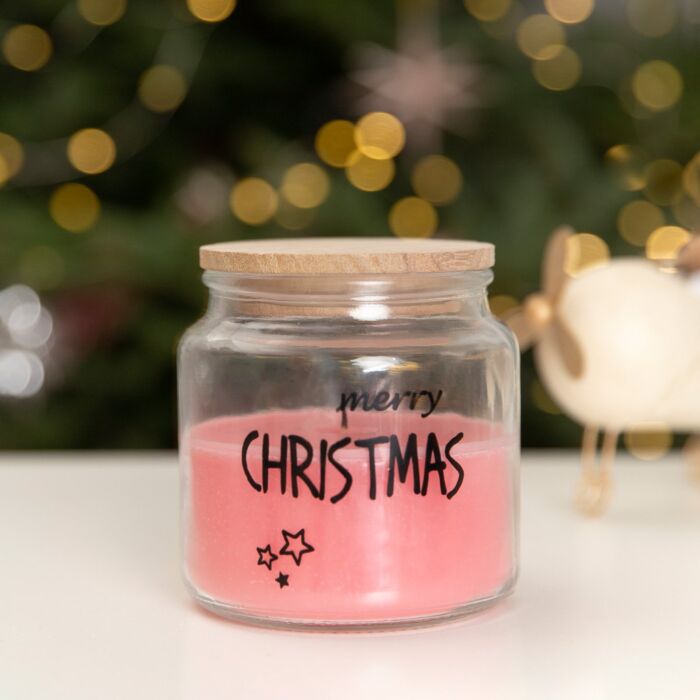 HOMLA Kerstgeurkaars met krentengeur, feestelijke inscriptie, 45 uur brandduur, paraffinewas en roze glazen behuizing.
