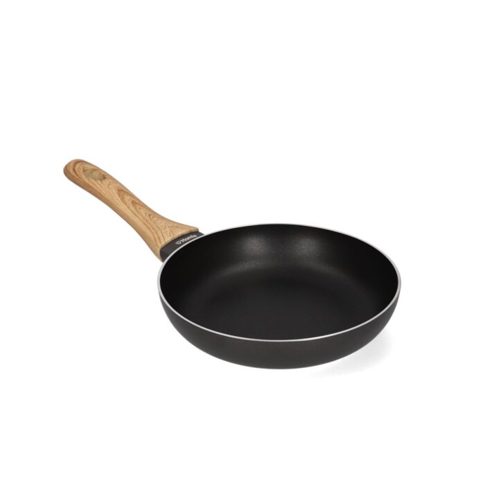 De pan warmt snel op en de aluminium bodem verdeelt de warmte gelijkmatig in de pan. Kan gebruikt worden op inductiekookplaten, elektrische kookplaten, gasfornuizen en keramische kookplaten. Buitenkant met matte afwerking en hout-imiterend handvat.