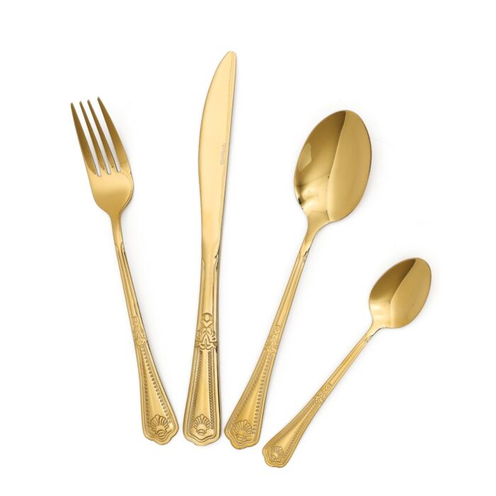 MERCER bestek is bewaard in een gouden kleur, wat ze een elegante uitstraling geeft. De MERCER set bestaat uit 24 elementen - 6 lepels, 6 vorken, 6 messen en 6 theelepels. Elk element heeft decoratieve groeven in de vorm van ornamenten die er karakter aan toevoegen. Origineel bestek past perfect bij elk servies.