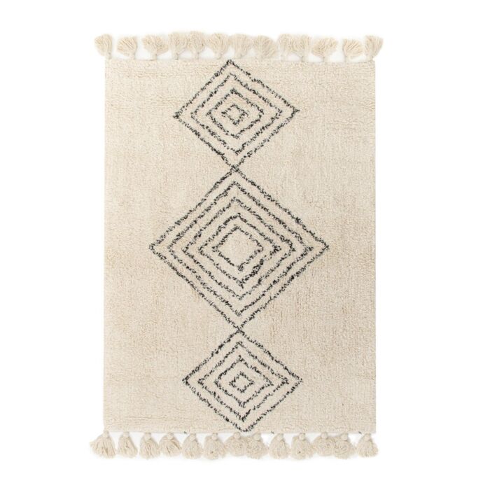 De Narpal loopbrug wordt gekenmerkt door een geometrisch patroon in het zwart op een beige achtergrond. Dit ontwerp harmonieert met verschillende kleuren in de kamer en is voorzien van grote kwasten aan twee zijden voor extra decoratief detail.