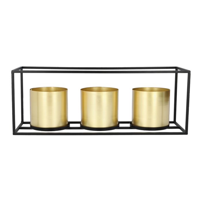 Deze ROCH-pot bestaat uit drie cilindervormige potten in goud, geplaatst in een zwart metalen frame. Dankzij de geïntegreerde ophanggaten bevestigt u de pot eenvoudig aan de muur. De potten zijn voorzien van een uitneembare binnenvoering, zodat u planten moeiteloos kunt herplanten. Totale afmetingen: 48 x 16 x 18 cm.