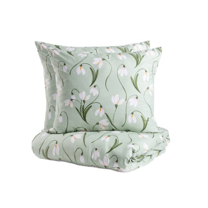 De combinatie van een mooi sneeuwklokje motief met een pastelgroene achtergrond creëert een ontspannen en uitnodigende sfeer in de slaapkamer. De stof is warm en zacht, perfect voor koude nachten en biedt een gezellige uitstraling.