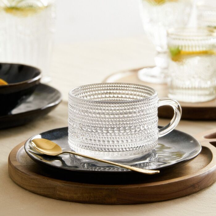 De HOMLA-theekop heeft een inhoud van 0,35 liter en is vervaardigd uit hoogwaardig, doorzichtig glas, dat zowel duurzaam als esthetisch aantrekkelijk is. De fijne afwerking geeft de kop een luxe uitstraling, perfect voor elke tafelsetting.
