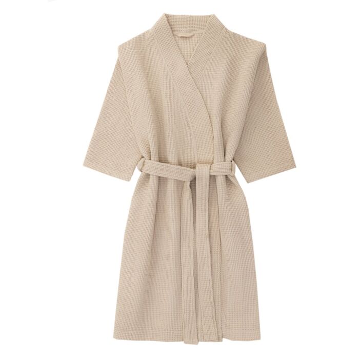 Vind je het leuk om je huid te verzorgen en te proberen deze van het beste te voorzien? Dan zul je de VAFFEL badjas zeker leuk vinden! Het zachte en lichtgewicht materiaal zal je lichaam aangenaam omhullen en je huid vrij laten ademen. De badjas wordt gekenmerkt door een eenvoudige snit die zich aanpast aan het lichaam nadat het in de taille met een touwtje is vastgebonden. Het heeft twee zakken die plaats bieden aan kleine items en een handvat waarmee je het aan een badkamerhanger kunt hangen. De beige kleur van de badjas benadrukt perfect de delicatesse van de huid en de wafelstof zorgt ervoor dat het er geweldig uitziet.
