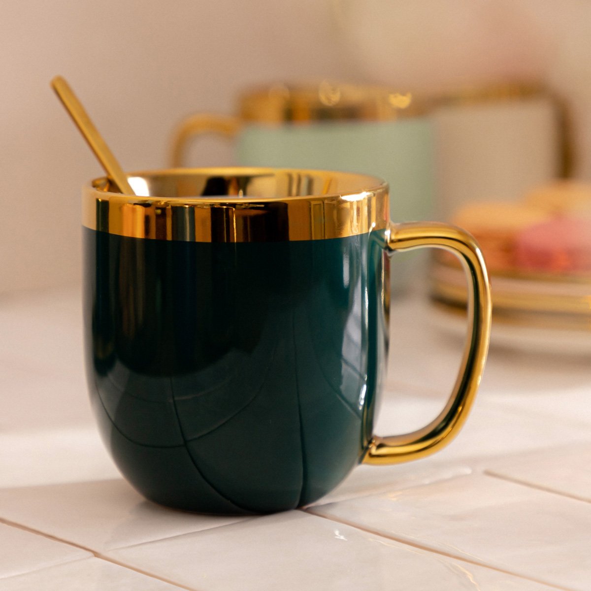 HOMLA | Sensorische mok met lepel en gouden decoratie – thee- en koffiemok 0,28 l, porselein, verguld, handgeschilderd, emerald & gold