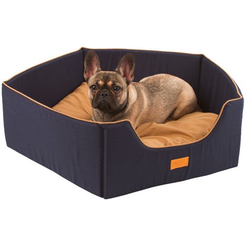 Dankzij het slimme hoekdesign past hondenmand Jerome perfect in iedere hoek. De diepblauwe stof met cognackleurige bies geeft een stijlvolle uitstraling. Het ligkussen is omkeerbaar.