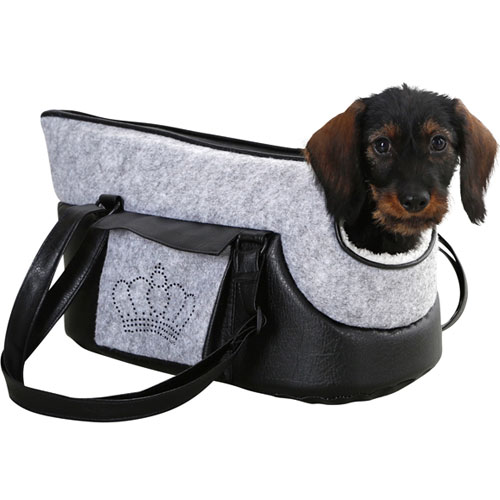 Mooie, sierlijke hondentas geschikt voor kleine hondenrassen, voorzien van een opdruk met steentjes in de vorm van een kroon. De tas beschikt over een riempje en heeft een heerlijk zacht kussentje aan de binnenkant.