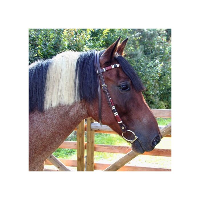 Dit stoere hoofdstel is vervaardigd uit eersteklas leder en voorzien van diverse versieringen van rundsleder. De frontriem zit in het middenstuk geknoopt voor een fraai aangezicht.
