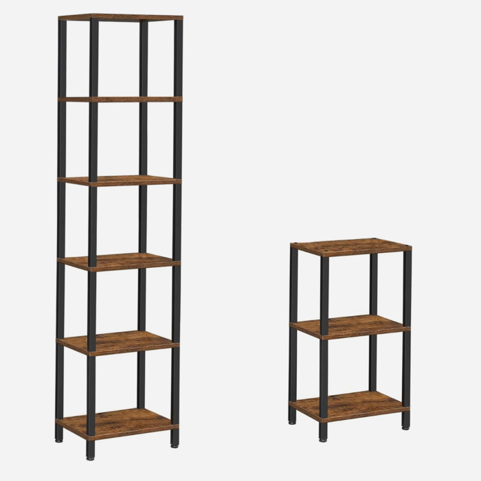 De afmetingen van de boekenkast zijn 37 cm breed, 27 cm diep en 166 cm hoog, waardoor het een ruimtebesparende oplossing is voor zowel kleine als grote kamers. Het frame bestaat uit stevig staal met een matzwarte afwerking, wat zorgt voor een moderne uitstraling. De planken zijn gemaakt van hoogwaardige spaanplaat die is afgewerkt in een aantrekkelijke vintage-look, perfect voor een warm en sfeervol interieur.
