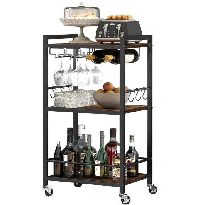 De serveerwagen heeft een compact formaat van 33 x 43 x 84 cm, wat hem ideaal maakt voor gebruik in kleine ruimtes. Gemaakt van stevig hout en metaal, kan hij makkelijk verschillende artikelen dragen, van servies tot drankjes, zonder in te boeten op stijl.