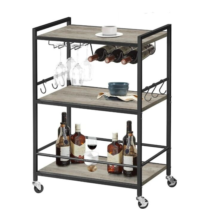 [Grote capaciteit] Afmetingen: 60x33x83 cm (BxDxH), deze barwagen met wijnrek en glashouder op de eerste laag kan maximaal 6 wijnglazen en 3 compartimenten voor het bewaren van wijnflessen bevatten. Hij kan ook worden gedemonteerd Als je hem niet wilt gebruiken.3 Planken waardoor er voldoende ruimte is voor je drankjes en snacks en waardoor hij handig genoeg is om in elke kamer te plaatsen.