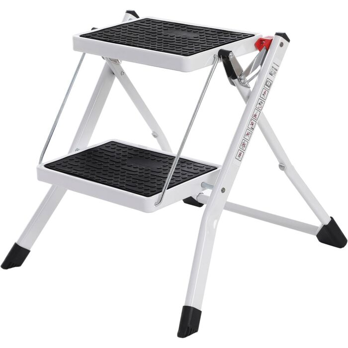 Met een compact formaat en handvat is het gemakkelijk te transporteren en op te bergen wanneer niet in gebruik. De antislip rubberen treden en antislipdoppen zorgen voor extra veiligheid tijdens gebruik.