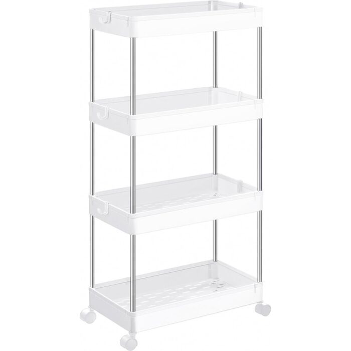 Is chaos je kamer aan het overnemen? Met slechts 40 x 22 x 86 cm ruimte biedt deze 4-laagse opbergkar met wielen een efficiënte oplossing om al je badkamerproducten, keukengerei of kantoordocumenten te ordenen. Nooit meer deuren duizend keer openen en sluiten tijdens het koken, dankzij de 4 universele wielen en gladde metalen stangen. De opbergkar is stevig en kan tot 5 kg per plank dragen, perfect voor al je opslagbehoeften. Gebruik de kar voor groenten en fruit met gaten in de planken voor goede ventilatie, en 3 extra haken om pannenlappen en vaatdoeken op te hangen. Deze opbergkar is een praktische en elegante toevoeging aan je woonkamer, keuken of badkamer.