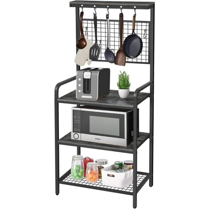 Dit Hoppa! Bakkersrek is een veelzijdig opbergrek dat kan dienen als koffiebar, keukeneiland, magnetronstandaard, kruidenrekorganizer, displayrek en meer voor zowel de keuken als woonkamer en thuiskantoor. Met zijn 3 grote aanrechtbladen en bovenste plank biedt het voldoende ruimte voor het plaatsen van diverse items zoals een koffiepot, magnetron, kruiden, borden, planten, broodrooster en blender. Het bakkersrek is voorzien van een gaaspaneel met 11 S-vormige haken waaraan potten, pannen, bestek, handdoeken, ovenwanten en andere keukenbenodigdheden kunnen worden opgehangen. Dit zorgt voor een opgeruimde en georganiseerde keuken met voldoende opbergruimte. Dit product is vervaardigd uit waterdicht, stevig en duurzaam materiaal, onderworpen aan strenge kwaliteitscontrole. De rustieke en moderne industriële stijl voegt een stijlvolle touch toe aan elke keuken. Het bakkersrek is eenvoudig te monteren met genummerde onderdelen en stapsgewijze instructies. Dankzij de antislip verstelbare voeten kan het rek op oneffen ondergronden worden geplaatst, waardoor uitglijden, glijden of krassen op de vloer worden voorkomen. Met een 100% tevredenheidsgarantie streven wij ernaar om premium kwaliteit en klantenservice te bieden. Bij vragen of opmerkingen staan wij klaar om te helpen.