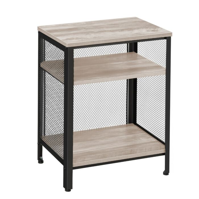 De bijzettafel heeft een formaat van 60 x 35 x 49 cm, wat hem ideaal maakt voor beperkte ruimtes. Het gebruik van hoogwaardige materialen zoals staal, spaanplaat en mesh zorgt voor een stevige constructie met een aantrekkelijk ontwerp. Het greige en zwarte kleurenschema maakt het gemakkelijk om de tafel te integreren in verschillende interieurstijlen.