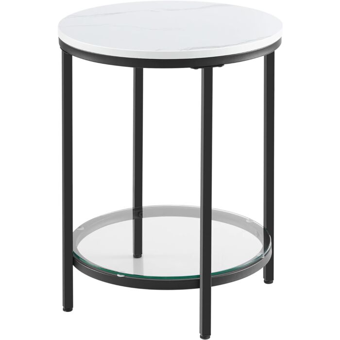 De bijzettafel heeft een diameter van 45 cm en een hoogte van 55 cm. Het tafelblad is gemaakt van hoogwaardige spaanplaat met marmerlook en de twee planken zijn vervaardigd van gehard glas.
