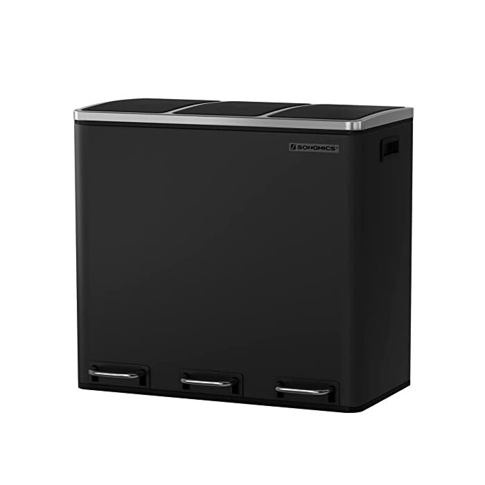 - Een vuilnisbak van 54 liter met een zilverkleurige romp, zwarte deksels en 3 compartimenten, handige pedalen en uitneembare binnenemmers.