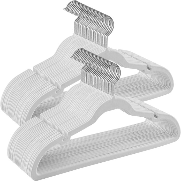 De Hoppa! fluwelen hangers zijn een praktische en elegante oplossing om uw kleding netjes en georganiseerd te houden. Met slimme schouderinkepingen die voorkomen dat kledingstukken wegglijden, een antislip fluweeloppervlak om kreukels tegen te gaan en de mogelijkheid om tot 5 kg per hanger te dragen, zijn deze hangers perfect voor elk type kledingstuk. Deze set van 50 wolkwitte hangers is vervaardigd uit duurzaam ABS-plastic en elke hanger is uitgerust met een broekstang en een 360° draaibare haak voor ultiem gebruiksgemak. Met een dikte van slechts 0,6 cm besparen ze kostbare kastruimte en zijn ze ideaal voor zowel thuisgebruik als professioneel gebruik. Afmetingen en materiaal De afmetingen van elke hanger zijn 16,9"B x 8,7"H (43 x 22 cm). Ze zijn gemaakt van fluweel en ABS-kunststof en hebben een stevige metalen haak. Functionaliteit en ontwerp Deze hangers zijn ontworpen voor maximale ruimtebesparing en gebruiksgemak, met slimme details zoals schouderinkepingen en een broekstang. Gebruik en toepassing Gebruik deze hangers om uw kledingkast efficiënt te organiseren en creëer een nette en opgeruimde uitstraling in elke ruimte. Kenmerken