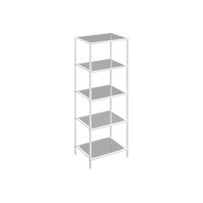 Met leigrijze glazen planken en een parelwit frame beschikt dit opbergrek met 5 niveaus over een prachtig modern minimalisme. Hiermee kunt u uw groen, boeken en verzamelobjecten tentoonstellen en tegelijkertijd de uitstraling van uw ruimte verbeteren.