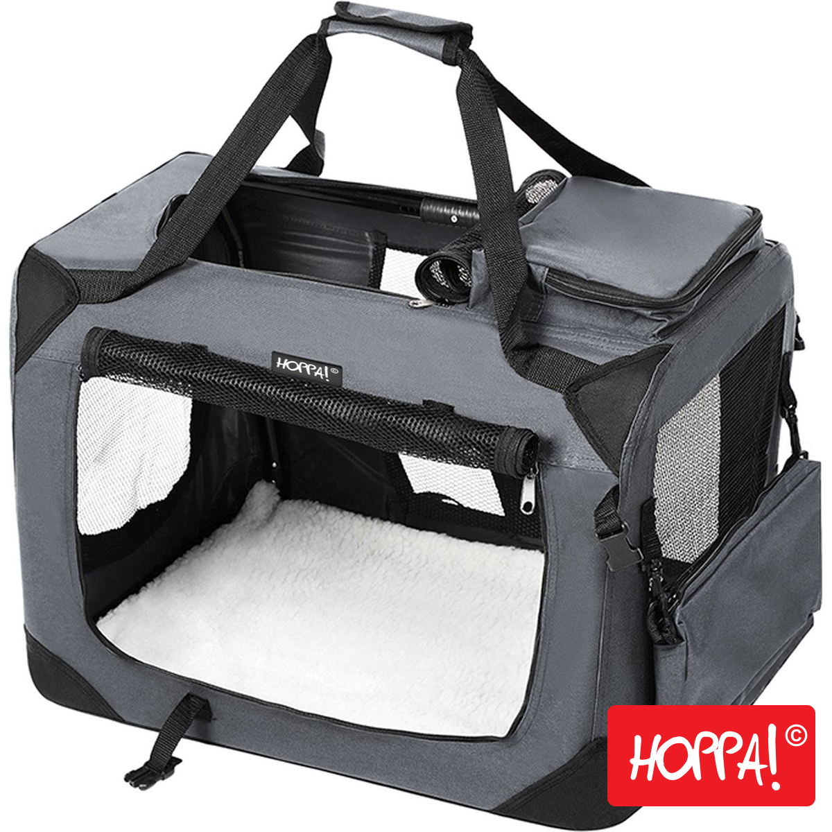 De Hoppa! hondenbox is een opvouwbare en handige transporttas voor huisdieren. Deze grijze hondenbox heeft afmetingen van 60 x 42 x 42 cm en is gemaakt van duurzame 600D Oxford-stof en staal. Het gewicht van de hondentas is slechts 3,2 kg, waardoor deze gemakkelijk te dragen en op te bergen is.