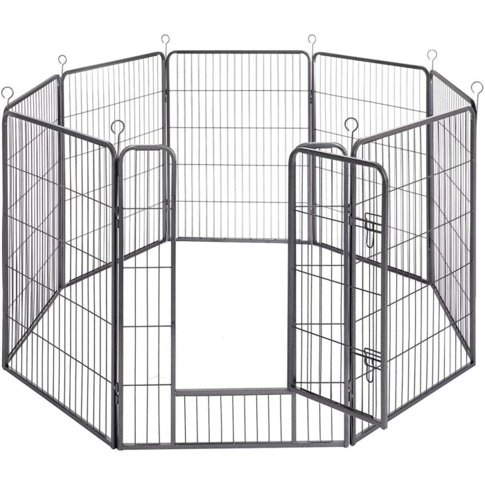 Het hondenhekje heeft een totale afmeting van 160x160 cm en bestaat uit 8 panelen van 80 x 100 cm hoog. Het is gemaakt van stevig metaal en heeft een grijze kleur.